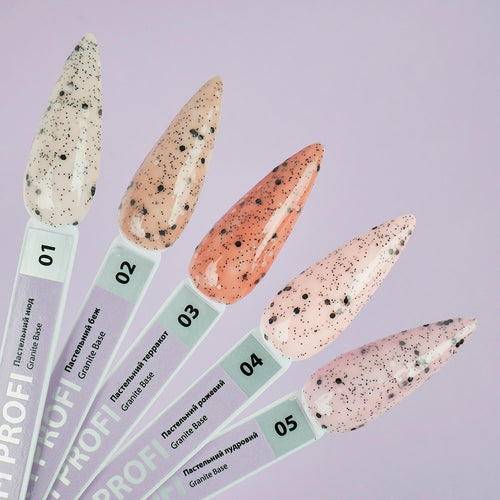 TUFI profi PREMIUM piedāvā jauno trendu līniju krāsainajām bāzēm Granite Base. Šī bāze veiksmīgi pilda galvenā dekoratīvā pārklājuma funkciju un ievērojami paātrina nagu dizaina procesu. Bāzes īpatnība ir tā, ka katra krāsa imitē granīta akmens tekstūru. Ieplūdes ir dažādu formu un izmēru, kas padara pārklājumu līdzīgu īstam akmenim. Ar jauno bāzu kolekciju var viegli radīt izcilu dizainu, jo nav nepieciešams izmantot papildus dekorus. TUFI profi bāze ir izturīga, neplaisā nodrošinot vieglu un patīkamu uzklāšanu. Pateicoties blīvai konsistencei, bāze viegli uzklājas uz naga, pati izlīdzinās uz nagu plātnes un stiprina to.
