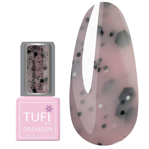 TUFI profi PREMIUM piedāvā jauno trendu līniju krāsainajām bāzēm Granite Base. Šī bāze veiksmīgi pilda galvenā dekoratīvā pārklājuma funkciju un ievērojami paātrina nagu dizaina procesu. Bāzes īpatnība ir tā, ka katra krāsa imitē granīta akmens tekstūru. Ieplūdes ir dažādu formu un izmēru, kas padara pārklājumu līdzīgu īstam akmenim. Ar jauno bāzu kolekciju var viegli radīt izcilu dizainu, jo nav nepieciešams izmantot papildus dekorus. TUFI profi bāze ir izturīga, neplaisā nodrošinot vieglu un patīkamu uzklāšanu. Pateicoties blīvai konsistencei, bāze viegli uzklājas uz naga, pati izlīdzinās uz nagu plātnes un stiprina to.