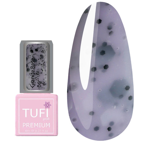 TUFI profi PREMIUM piedāvā jauno trendu līniju krāsainajām bāzēm Granite Base. Šī bāze veiksmīgi pilda galvenā dekoratīvā pārklājuma funkciju un ievērojami paātrina nagu dizaina procesu. Bāzes īpatnība ir tā, ka katra krāsa imitē granīta akmens tekstūru. Ieplūdes ir dažādu formu un izmēru, kas padara pārklājumu līdzīgu īstam akmenim. Ar jauno bāzu kolekciju var viegli radīt izcilu dizainu, jo nav nepieciešams izmantot papildus dekorus. TUFI profi bāze ir izturīga, neplaisā nodrošinot vieglu un patīkamu uzklāšanu. Pateicoties blīvai konsistencei, bāze viegli uzklājas uz naga, pati izlīdzinās uz nagu plātnes un stiprina to.
